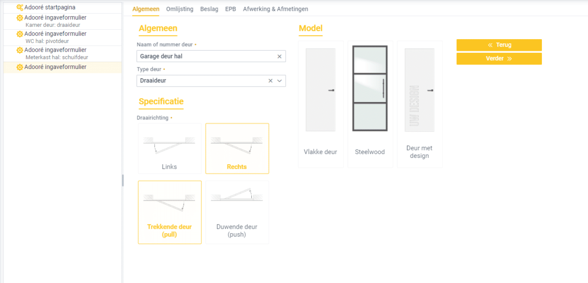 Het uiteindelijke doel is natuurlijk dat de dealers zelf foutloos en eenvoudig deuren kunnen configureren en offreren voor hun klanten. Merkato Essentials maakt dit mogelijk met behulp van een dynamische vragenlijst. Op basis van de gewenste specificaties, stellen dealers hierin zelf hun deuren samen. Met één druk op de knop worden deze besteld! Snel, foutloos en eenvoudig. Dit verhoogt de mate van professionaliteit richting de klant. Merkato Essentials voegt daar echter bovenop nog wat extra’s toe. Zo is het met de projectcatalogus-functionaliteit eenvoudiger om snel meerdere deuren te bestellen. En de afbeeldingen die hierbij gebruikt worden, maken het voor de dealer zeer helder wat zij aan het configureren zijn.